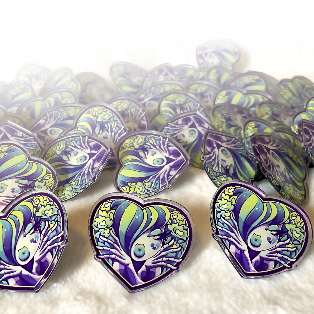 Each pin is made from an acrylic material, printed in full color and cut to shape. Each pin features a durable, rubber clutch, allowing you to fasten your pin to your clothes, backpack, or accessories.