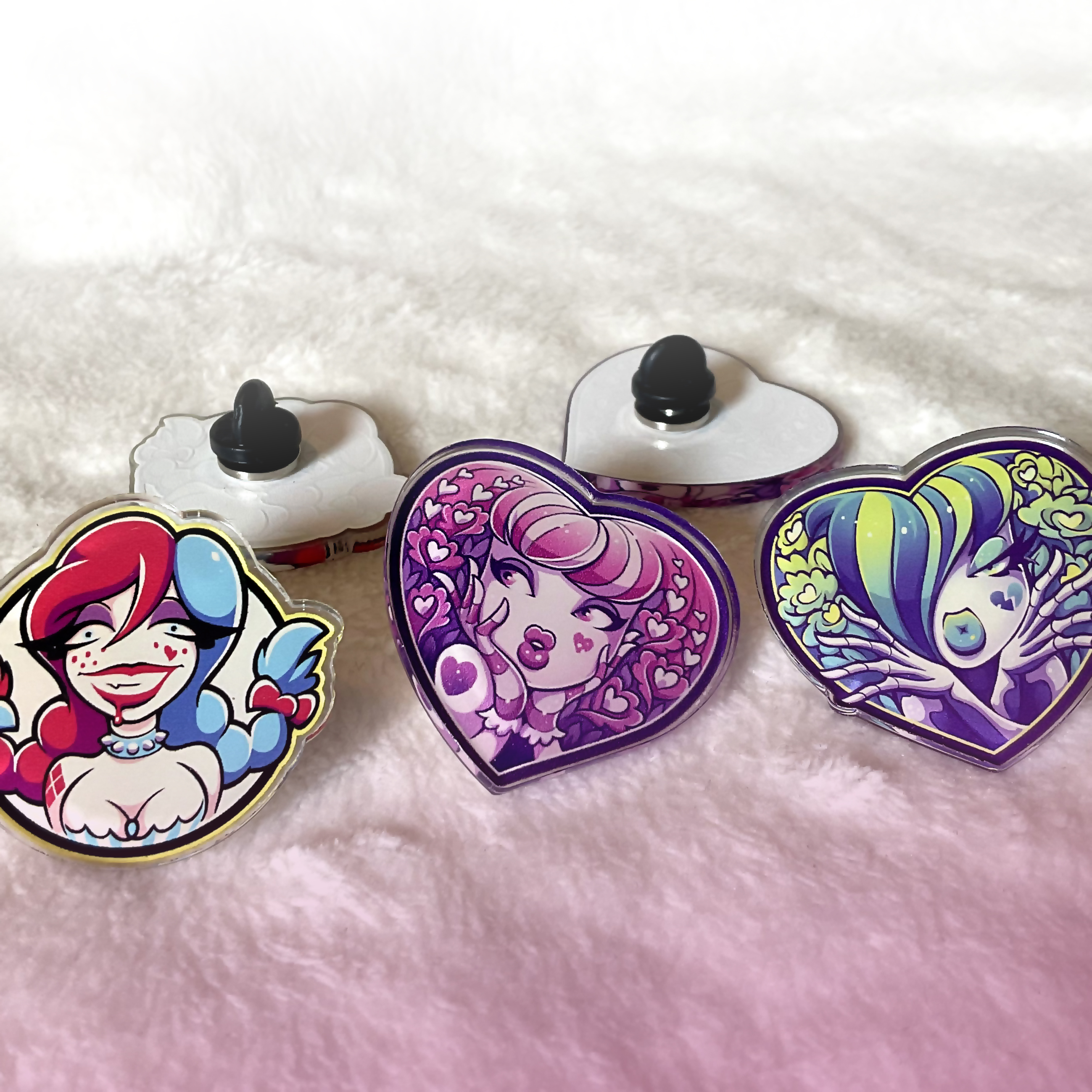 Each pin is made from an acrylic material, printed in full color and cut to shape. Each pin features a durable, rubber clutch, allowing you to fasten your pin to your clothes, backpack, or accessories.