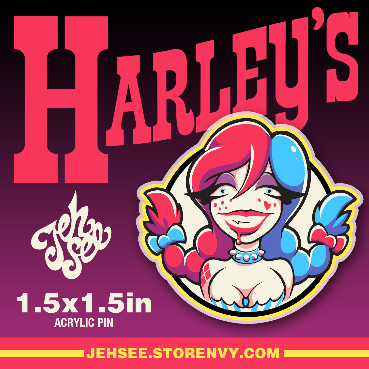 This listing is for THREE 1.5"x1.5" acrylic pins. Includes one of each LOVEMAKER, HEARTBREAKER & HARLEY'S pins.